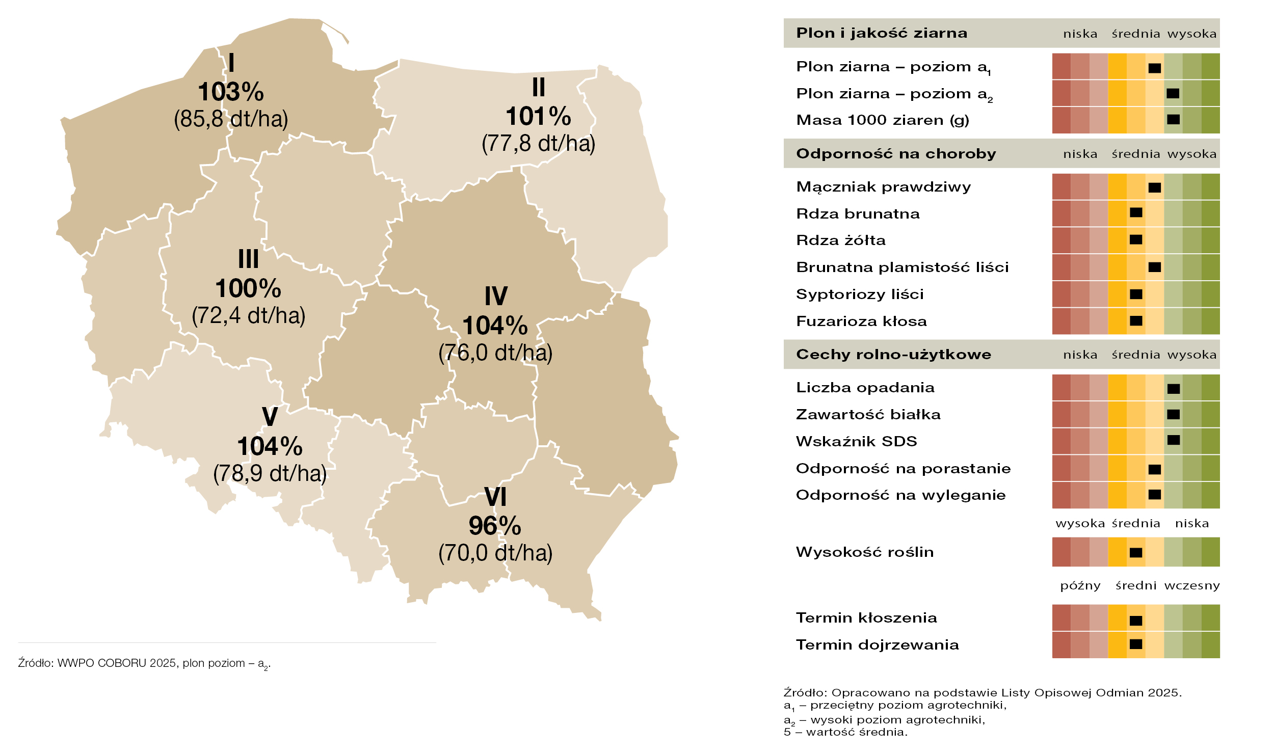 - Wczesny termin kłoszenia i dojrzewania – bardzo dobra tolerancja na okresowe niedobory wody, doskonały komponent do mieszanek zbożowych